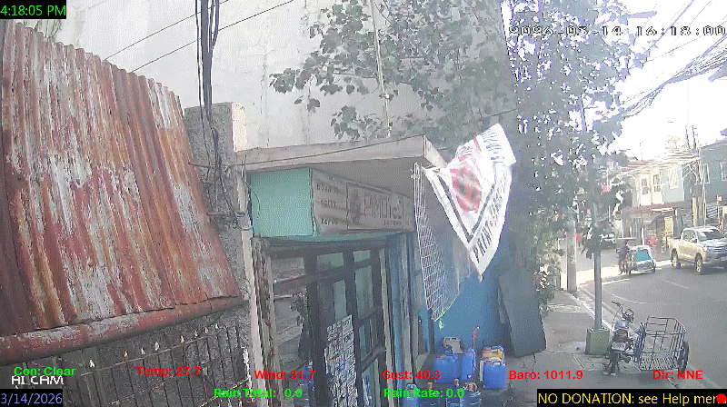 1 Rain season in the Philippines: June 1st to Oct 31st.   5 Estimated amount of water needed to replace the water used by plants and evaporation from the past week. (Negative numbers mean amount of water needed, positive numbers mean excess water is present).   6 Air Quality Index is provided by Luftdaten System esp8266 and is updated every 5 mins..   9 Solar Index represents either an absolute scale of solar energy (W/m²) using the station’s recorded maximum or a percentage of computed theoretical solar maximum using the station’s location and time of day. These indices differ most when the sun is low on the horizon. The current scale is shown, and will toggle if it or the icon is clicked.   10 Historical average only to day 14 of just the month of March for this station since 2016.   11 Historical average rain this season to day 14 of March for this station since 2016.