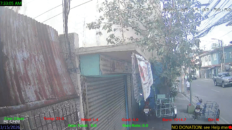 1 Rain season in the Philippines: June 1st to Oct 31st.   5 Estimated amount of water needed to replace the water used by plants and evaporation from the past week. (Negative numbers mean amount of water needed, positive numbers mean excess water is present).   6 Air Quality Index is provided by Luftdaten System esp8266 and is updated every 5 mins..   10 Historical average only to day 15 of just the month of March for this station since 2016.   11 Historical average rain this season to day 15 of March for this station since 2016.