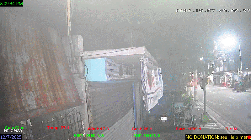 1 Rain season in the Philippines: June 1st to Oct 31st.   5 Estimated amount of water needed to replace the water used by plants and evaporation from the past week. (Negative numbers mean amount of water needed, positive numbers mean excess water is present).   6 Air Quality Index is provided by Luftdaten System esp8266 and is updated every 5 mins..   9 Solar Index represents either an absolute scale of solar energy (W/m²) using the station’s recorded maximum or a percentage of computed theoretical solar maximum using the station’s location and time of day. These indices differ most when the sun is low on the horizon. The current scale is shown, and will toggle if it or the icon is clicked.   10 Historical average only to day 7 of just the month of December for this station since 2016.   11 Historical average rain this season to day 7 of December for this station since 2016.