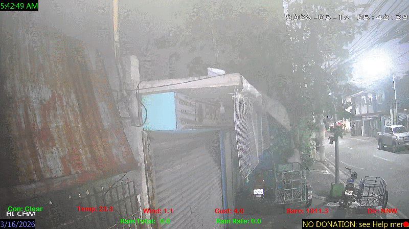1 Rain season in the Philippines: June 1st to Oct 31st.   5 Estimated amount of water needed to replace the water used by plants and evaporation from the past week. (Negative numbers mean amount of water needed, positive numbers mean excess water is present).   6 Air Quality Index is provided by Luftdaten System esp8266 and is updated every 5 mins..   9 Solar Index represents either an absolute scale of solar energy (W/m²) using the station’s recorded maximum or a percentage of computed theoretical solar maximum using the station’s location and time of day. These indices differ most when the sun is low on the horizon. The current scale is shown, and will toggle if it or the icon is clicked.   10 Historical average only to day 15 of just the month of March for this station since 2016.   11 Historical average rain this season to day 15 of March for this station since 2016.