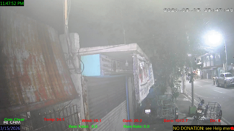 1 Rain season in the Philippines: June 1st to Oct 31st.   5 Estimated amount of water needed to replace the water used by plants and evaporation from the past week. (Negative numbers mean amount of water needed, positive numbers mean excess water is present).   6 Air Quality Index is provided by Luftdaten System esp8266 and is updated every 5 mins..   9 Solar Index represents either an absolute scale of solar energy (W/m²) using the station’s recorded maximum or a percentage of computed theoretical solar maximum using the station’s location and time of day. These indices differ most when the sun is low on the horizon. The current scale is shown, and will toggle if it or the icon is clicked.   10 Historical average only to day 15 of just the month of March for this station since 2016.   11 Historical average rain this season to day 15 of March for this station since 2016.