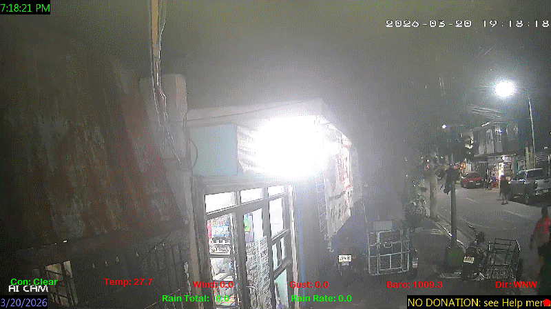 1 Rain season in the Philippines: June 1st to Oct 31st.   5 Estimated amount of water needed to replace the water used by plants and evaporation from the past week. (Negative numbers mean amount of water needed, positive numbers mean excess water is present).   6 Air Quality Index is provided by Luftdaten System esp8266 and is updated every 5 mins..   9 Solar Index represents either an absolute scale of solar energy (W/m²) using the station’s recorded maximum or a percentage of computed theoretical solar maximum using the station’s location and time of day. These indices differ most when the sun is low on the horizon. The current scale is shown, and will toggle if it or the icon is clicked.   10 Historical average only to day 20 of just the month of March for this station since 2016.   11 Historical average rain this season to day 20 of March for this station since 2016.