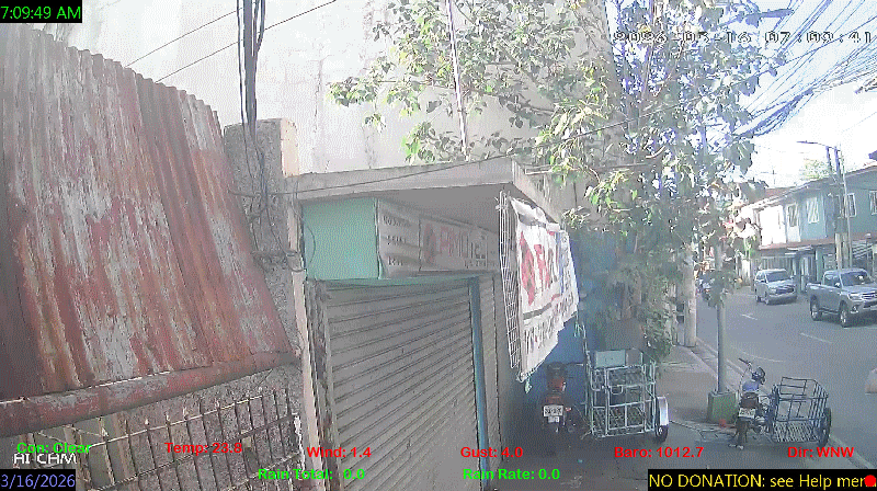1 Rain season in the Philippines: June 1st to Oct 31st.   5 Estimated amount of water needed to replace the water used by plants and evaporation from the past week. (Negative numbers mean amount of water needed, positive numbers mean excess water is present).   6 Air Quality Index is provided by Luftdaten System esp8266 and is updated every 5 mins..   9 Solar Index represents either an absolute scale of solar energy (W/m²) using the station’s recorded maximum or a percentage of computed theoretical solar maximum using the station’s location and time of day. These indices differ most when the sun is low on the horizon. The current scale is shown, and will toggle if it or the icon is clicked.   10 Historical average only to day 15 of just the month of March for this station since 2016.   11 Historical average rain this season to day 15 of March for this station since 2016.