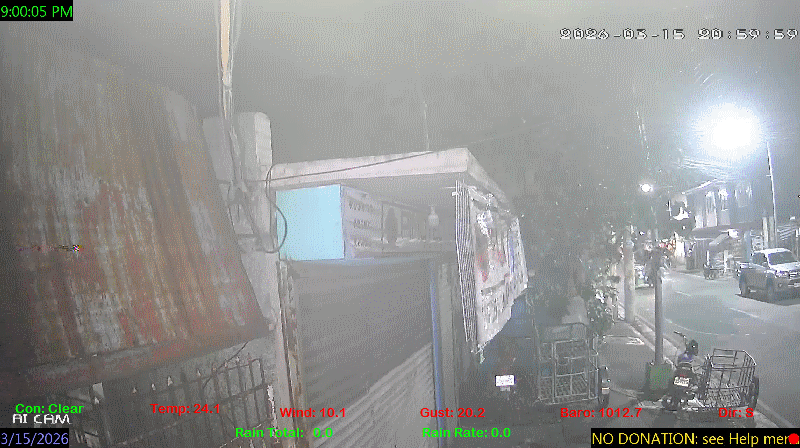 1 Rain season in the Philippines: June 1st to Oct 31st.   5 Estimated amount of water needed to replace the water used by plants and evaporation from the past week. (Negative numbers mean amount of water needed, positive numbers mean excess water is present).   6 Air Quality Index is provided by Luftdaten System esp8266 and is updated every 5 mins..   9 Solar Index represents either an absolute scale of solar energy (W/m²) using the station’s recorded maximum or a percentage of computed theoretical solar maximum using the station’s location and time of day. These indices differ most when the sun is low on the horizon. The current scale is shown, and will toggle if it or the icon is clicked.   10 Historical average only to day 15 of just the month of March for this station since 2016.   11 Historical average rain this season to day 15 of March for this station since 2016.