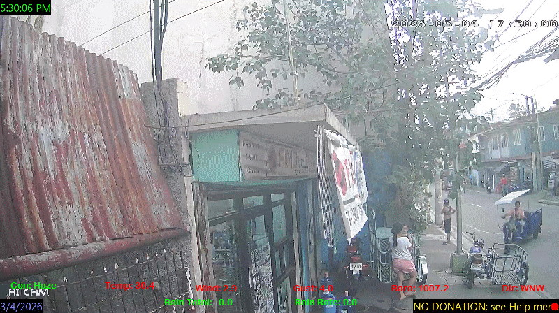 1 Rain season in the Philippines: June 1st to Oct 31st.   5 Estimated amount of water needed to replace the water used by plants and evaporation from the past week. (Negative numbers mean amount of water needed, positive numbers mean excess water is present).   6 Air Quality Index is provided by Luftdaten System esp8266 and is updated every 5 mins..   9 Solar Index represents either an absolute scale of solar energy (W/m²) using the station’s recorded maximum or a percentage of computed theoretical solar maximum using the station’s location and time of day. These indices differ most when the sun is low on the horizon. The current scale is shown, and will toggle if it or the icon is clicked.   10 Historical average only to day 4 of just the month of March for this station since 2016.   11 Historical average rain this season to day 4 of March for this station since 2016.