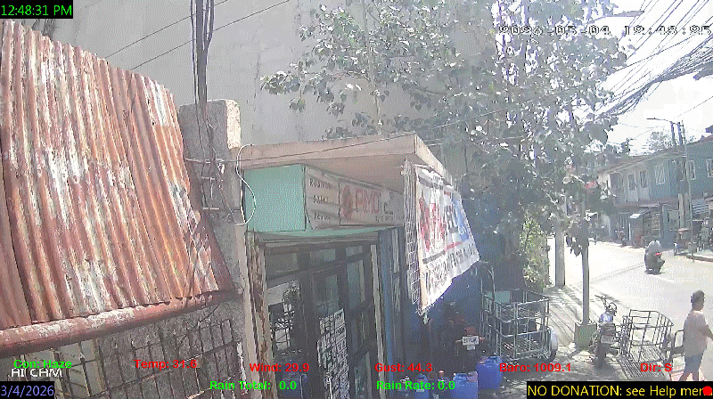 1 Rain season in the Philippines: June 1st to Oct 31st.   5 Estimated amount of water needed to replace the water used by plants and evaporation from the past week. (Negative numbers mean amount of water needed, positive numbers mean excess water is present).   6 Air Quality Index is provided by Luftdaten System esp8266 and is updated every 5 mins..   9 Solar Index represents either an absolute scale of solar energy (W/m²) using the station’s recorded maximum or a percentage of computed theoretical solar maximum using the station’s location and time of day. These indices differ most when the sun is low on the horizon. The current scale is shown, and will toggle if it or the icon is clicked.   10 Historical average only to day 4 of just the month of March for this station since 2016.   11 Historical average rain this season to day 4 of March for this station since 2016.