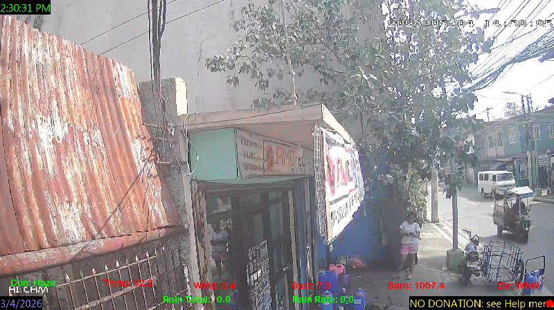 1 Rain season in the Philippines: June 1st to Oct 31st.   5 Estimated amount of water needed to replace the water used by plants and evaporation from the past week. (Negative numbers mean amount of water needed, positive numbers mean excess water is present).   6 Air Quality Index is provided by Luftdaten System esp8266 and is updated every 5 mins..   9 Solar Index represents either an absolute scale of solar energy (W/m²) using the station’s recorded maximum or a percentage of computed theoretical solar maximum using the station’s location and time of day. These indices differ most when the sun is low on the horizon. The current scale is shown, and will toggle if it or the icon is clicked.   10 Historical average only to day 4 of just the month of March for this station since 2016.   11 Historical average rain this season to day 4 of March for this station since 2016.