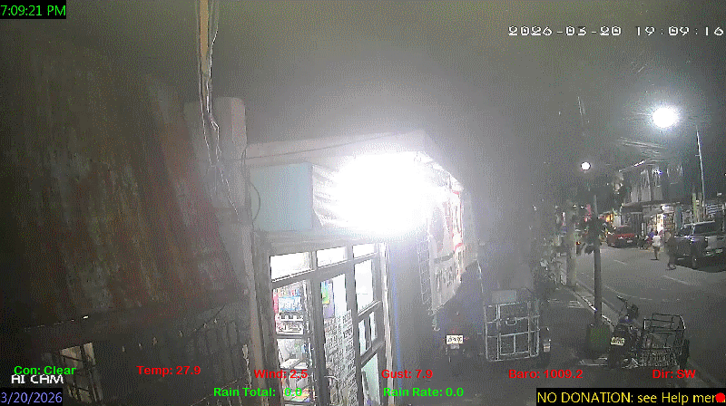 1 Rain season in the Philippines: June 1st to Oct 31st.   5 Estimated amount of water needed to replace the water used by plants and evaporation from the past week. (Negative numbers mean amount of water needed, positive numbers mean excess water is present).   6 Air Quality Index is provided by Luftdaten System esp8266 and is updated every 5 mins..   9 Solar Index represents either an absolute scale of solar energy (W/m²) using the station’s recorded maximum or a percentage of computed theoretical solar maximum using the station’s location and time of day. These indices differ most when the sun is low on the horizon. The current scale is shown, and will toggle if it or the icon is clicked.   10 Historical average only to day 20 of just the month of March for this station since 2016.   11 Historical average rain this season to day 20 of March for this station since 2016.