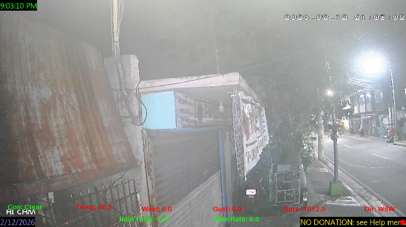 1 Rain season in the Philippines: June 1st to Oct 31st.   5 Estimated amount of water needed to replace the water used by plants and evaporation from the past week. (Negative numbers mean amount of water needed, positive numbers mean excess water is present).   6 Air Quality Index is provided by Luftdaten System esp8266 and is updated every 5 mins..   9 Solar Index represents either an absolute scale of solar energy (W/m²) using the station’s recorded maximum or a percentage of computed theoretical solar maximum using the station’s location and time of day. These indices differ most when the sun is low on the horizon. The current scale is shown, and will toggle if it or the icon is clicked.   10 Historical average only to day 12 of just the month of February for this station since 2016.   11 Historical average rain this season to day 12 of February for this station since 2016.