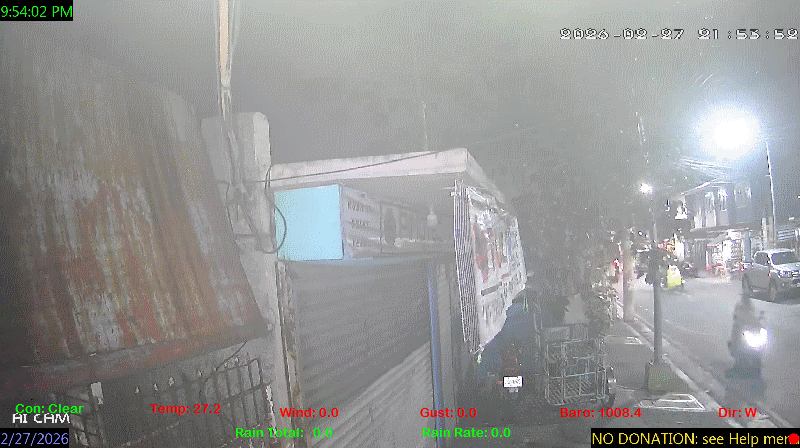 1 Rain season in the Philippines: June 1st to Oct 31st.   5 Estimated amount of water needed to replace the water used by plants and evaporation from the past week. (Negative numbers mean amount of water needed, positive numbers mean excess water is present).   6 Air Quality Index is provided by Luftdaten System esp8266 and is updated every 5 mins..   9 Solar Index represents either an absolute scale of solar energy (W/m²) using the station’s recorded maximum or a percentage of computed theoretical solar maximum using the station’s location and time of day. These indices differ most when the sun is low on the horizon. The current scale is shown, and will toggle if it or the icon is clicked.   10 Historical average only to day 27 of just the month of February for this station since 2016.   11 Historical average rain this season to day 27 of February for this station since 2016.