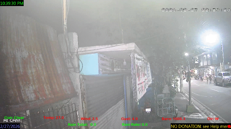 1 Rain season in the Philippines: June 1st to Oct 31st.   5 Estimated amount of water needed to replace the water used by plants and evaporation from the past week. (Negative numbers mean amount of water needed, positive numbers mean excess water is present).   6 Air Quality Index is provided by Luftdaten System esp8266 and is updated every 5 mins..   9 Solar Index represents either an absolute scale of solar energy (W/m²) using the station’s recorded maximum or a percentage of computed theoretical solar maximum using the station’s location and time of day. These indices differ most when the sun is low on the horizon. The current scale is shown, and will toggle if it or the icon is clicked.   10 Historical average only to day 27 of just the month of February for this station since 2016.   11 Historical average rain this season to day 27 of February for this station since 2016.