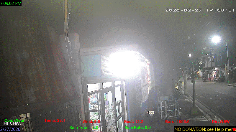 1 Rain season in the Philippines: June 1st to Oct 31st.   5 Estimated amount of water needed to replace the water used by plants and evaporation from the past week. (Negative numbers mean amount of water needed, positive numbers mean excess water is present).   6 Air Quality Index is provided by Luftdaten System esp8266 and is updated every 5 mins..   9 Solar Index represents either an absolute scale of solar energy (W/m²) using the station’s recorded maximum or a percentage of computed theoretical solar maximum using the station’s location and time of day. These indices differ most when the sun is low on the horizon. The current scale is shown, and will toggle if it or the icon is clicked.   10 Historical average only to day 27 of just the month of February for this station since 2016.   11 Historical average rain this season to day 27 of February for this station since 2016.