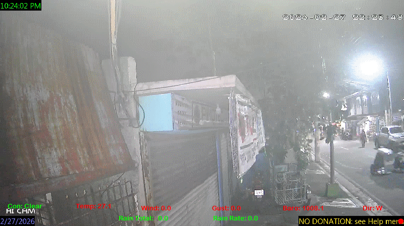 1 Rain season in the Philippines: June 1st to Oct 31st.   5 Estimated amount of water needed to replace the water used by plants and evaporation from the past week. (Negative numbers mean amount of water needed, positive numbers mean excess water is present).   6 Air Quality Index is provided by Luftdaten System esp8266 and is updated every 5 mins..   9 Solar Index represents either an absolute scale of solar energy (W/m²) using the station’s recorded maximum or a percentage of computed theoretical solar maximum using the station’s location and time of day. These indices differ most when the sun is low on the horizon. The current scale is shown, and will toggle if it or the icon is clicked.   10 Historical average only to day 27 of just the month of February for this station since 2016.   11 Historical average rain this season to day 27 of February for this station since 2016.