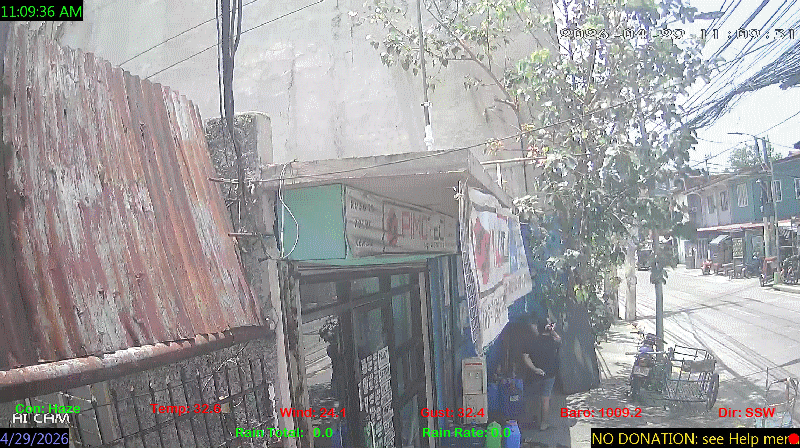 1 Rain season in the Philippines: June 1st to Oct 31st.   5 Estimated amount of water needed to replace the water used by plants and evaporation from the past week. (Negative numbers mean amount of water needed, positive numbers mean excess water is present).   6 Air Quality Index is provided by Luftdaten System esp8266 and is updated every 5 mins..   9 Solar Index represents either an absolute scale of solar energy (W/m²) using the station’s recorded maximum or a percentage of computed theoretical solar maximum using the station’s location and time of day. These indices differ most when the sun is low on the horizon. The current scale is shown, and will toggle if it or the icon is clicked.   10 Historical average only to day 29 of just the month of April for this station since 2017.   11 Historical average rain this season to day 29 of April for this station since 2017.