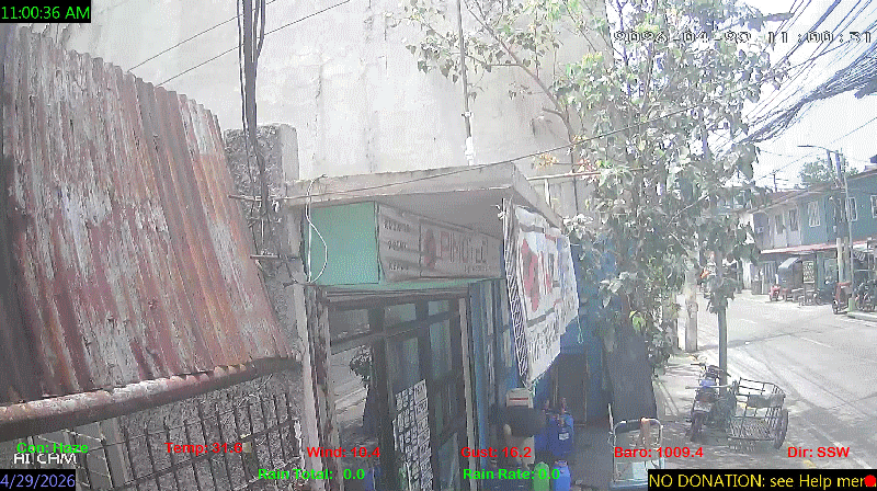 1 Rain season in the Philippines: June 1st to Oct 31st.   5 Estimated amount of water needed to replace the water used by plants and evaporation from the past week. (Negative numbers mean amount of water needed, positive numbers mean excess water is present).   6 Air Quality Index is provided by Luftdaten System esp8266 and is updated every 5 mins..   9 Solar Index represents either an absolute scale of solar energy (W/m²) using the station’s recorded maximum or a percentage of computed theoretical solar maximum using the station’s location and time of day. These indices differ most when the sun is low on the horizon. The current scale is shown, and will toggle if it or the icon is clicked.   10 Historical average only to day 29 of just the month of April for this station since 2017.   11 Historical average rain this season to day 29 of April for this station since 2017.