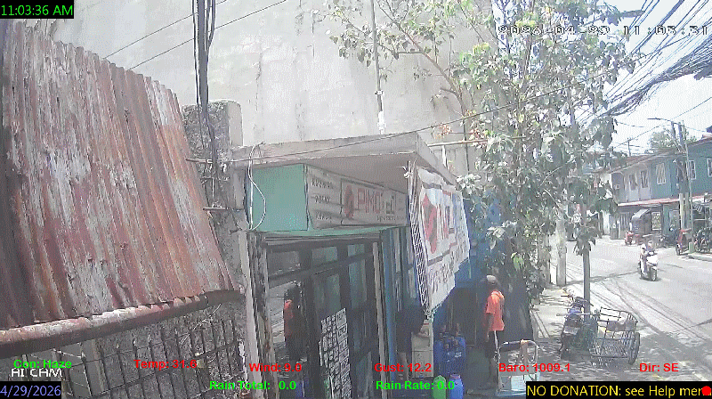 1 Rain season in the Philippines: June 1st to Oct 31st.   5 Estimated amount of water needed to replace the water used by plants and evaporation from the past week. (Negative numbers mean amount of water needed, positive numbers mean excess water is present).   6 Air Quality Index is provided by Luftdaten System esp8266 and is updated every 5 mins..   9 Solar Index represents either an absolute scale of solar energy (W/m²) using the station’s recorded maximum or a percentage of computed theoretical solar maximum using the station’s location and time of day. These indices differ most when the sun is low on the horizon. The current scale is shown, and will toggle if it or the icon is clicked.   10 Historical average only to day 29 of just the month of April for this station since 2017.   11 Historical average rain this season to day 29 of April for this station since 2017.