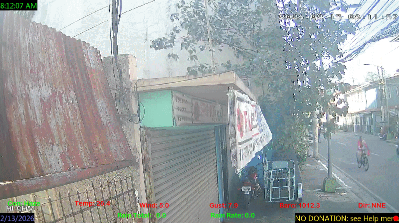1 Rain season in the Philippines: June 1st to Oct 31st.   5 Estimated amount of water needed to replace the water used by plants and evaporation from the past week. (Negative numbers mean amount of water needed, positive numbers mean excess water is present).   6 Air Quality Index is provided by Luftdaten System esp8266 and is updated every 5 mins..   9 Solar Index represents either an absolute scale of solar energy (W/m²) using the station’s recorded maximum or a percentage of computed theoretical solar maximum using the station’s location and time of day. These indices differ most when the sun is low on the horizon. The current scale is shown, and will toggle if it or the icon is clicked.   10 Historical average only to day 13 of just the month of February for this station since 2016.   11 Historical average rain this season to day 13 of February for this station since 2016.