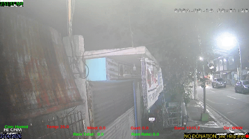 1 Rain season in the Philippines: June 1st to Oct 31st.   5 Estimated amount of water needed to replace the water used by plants and evaporation from the past week. (Negative numbers mean amount of water needed, positive numbers mean excess water is present).   6 Air Quality Index is provided by Luftdaten System esp8266 and is updated every 5 mins..   9 Solar Index represents either an absolute scale of solar energy (W/m²) using the station’s recorded maximum or a percentage of computed theoretical solar maximum using the station’s location and time of day. These indices differ most when the sun is low on the horizon. The current scale is shown, and will toggle if it or the icon is clicked.   10 Historical average only to day 13 of just the month of February for this station since 2016.   11 Historical average rain this season to day 13 of February for this station since 2016.