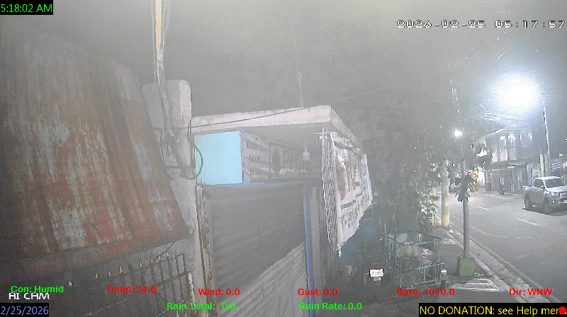 1 Rain season in the Philippines: June 1st to Oct 31st.   5 Estimated amount of water needed to replace the water used by plants and evaporation from the past week. (Negative numbers mean amount of water needed, positive numbers mean excess water is present).   6 Air Quality Index is provided by Luftdaten System esp8266 and is updated every 5 mins..   9 Solar Index represents either an absolute scale of solar energy (W/m²) using the station’s recorded maximum or a percentage of computed theoretical solar maximum using the station’s location and time of day. These indices differ most when the sun is low on the horizon. The current scale is shown, and will toggle if it or the icon is clicked.   10 Historical average only to day 25 of just the month of February for this station since 2016.   11 Historical average rain this season to day 25 of February for this station since 2016.