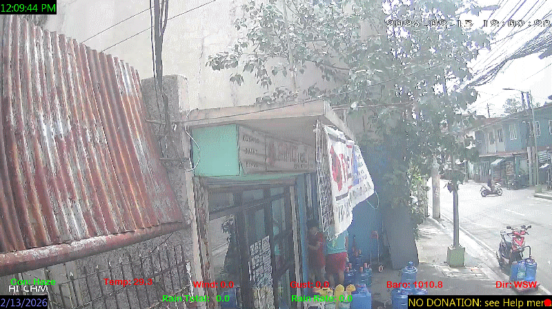 1 Rain season in the Philippines: June 1st to Oct 31st.   5 Estimated amount of water needed to replace the water used by plants and evaporation from the past week. (Negative numbers mean amount of water needed, positive numbers mean excess water is present).   6 Air Quality Index is provided by Luftdaten System esp8266 and is updated every 5 mins..   9 Solar Index represents either an absolute scale of solar energy (W/m²) using the station’s recorded maximum or a percentage of computed theoretical solar maximum using the station’s location and time of day. These indices differ most when the sun is low on the horizon. The current scale is shown, and will toggle if it or the icon is clicked.   10 Historical average only to day 13 of just the month of February for this station since 2016.   11 Historical average rain this season to day 13 of February for this station since 2016.