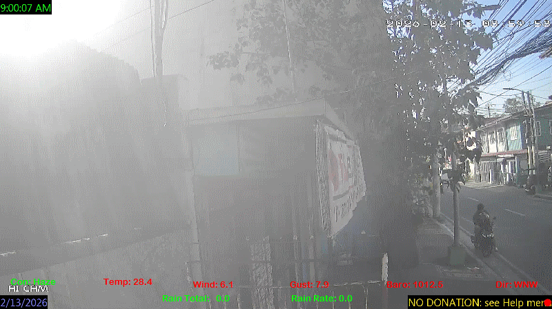 1 Rain season in the Philippines: June 1st to Oct 31st.   5 Estimated amount of water needed to replace the water used by plants and evaporation from the past week. (Negative numbers mean amount of water needed, positive numbers mean excess water is present).   6 Air Quality Index is provided by Luftdaten System esp8266 and is updated every 5 mins..   9 Solar Index represents either an absolute scale of solar energy (W/m²) using the station’s recorded maximum or a percentage of computed theoretical solar maximum using the station’s location and time of day. These indices differ most when the sun is low on the horizon. The current scale is shown, and will toggle if it or the icon is clicked.   10 Historical average only to day 13 of just the month of February for this station since 2016.   11 Historical average rain this season to day 13 of February for this station since 2016.