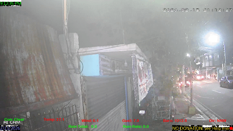 1 Rain season in the Philippines: June 1st to Oct 31st.   5 Estimated amount of water needed to replace the water used by plants and evaporation from the past week. (Negative numbers mean amount of water needed, positive numbers mean excess water is present).   6 Air Quality Index is provided by Luftdaten System esp8266 and is updated every 5 mins..   9 Solar Index represents either an absolute scale of solar energy (W/m²) using the station’s recorded maximum or a percentage of computed theoretical solar maximum using the station’s location and time of day. These indices differ most when the sun is low on the horizon. The current scale is shown, and will toggle if it or the icon is clicked.   10 Historical average only to day 13 of just the month of February for this station since 2016.   11 Historical average rain this season to day 13 of February for this station since 2016.