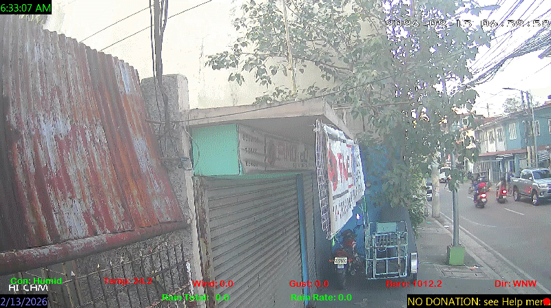 1 Rain season in the Philippines: June 1st to Oct 31st.   5 Estimated amount of water needed to replace the water used by plants and evaporation from the past week. (Negative numbers mean amount of water needed, positive numbers mean excess water is present).   6 Air Quality Index is provided by Luftdaten System esp8266 and is updated every 5 mins..   9 Solar Index represents either an absolute scale of solar energy (W/m²) using the station’s recorded maximum or a percentage of computed theoretical solar maximum using the station’s location and time of day. These indices differ most when the sun is low on the horizon. The current scale is shown, and will toggle if it or the icon is clicked.   10 Historical average only to day 13 of just the month of February for this station since 2016.   11 Historical average rain this season to day 13 of February for this station since 2016.