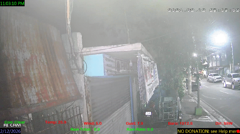 1 Rain season in the Philippines: June 1st to Oct 31st.   5 Estimated amount of water needed to replace the water used by plants and evaporation from the past week. (Negative numbers mean amount of water needed, positive numbers mean excess water is present).   6 Air Quality Index is provided by Luftdaten System esp8266 and is updated every 5 mins..   9 Solar Index represents either an absolute scale of solar energy (W/m²) using the station’s recorded maximum or a percentage of computed theoretical solar maximum using the station’s location and time of day. These indices differ most when the sun is low on the horizon. The current scale is shown, and will toggle if it or the icon is clicked.   10 Historical average only to day 12 of just the month of February for this station since 2016.   11 Historical average rain this season to day 12 of February for this station since 2016.