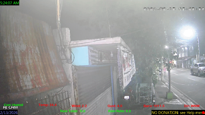 1 Rain season in the Philippines: June 1st to Oct 31st.   5 Estimated amount of water needed to replace the water used by plants and evaporation from the past week. (Negative numbers mean amount of water needed, positive numbers mean excess water is present).   6 Air Quality Index is provided by Luftdaten System esp8266 and is updated every 5 mins..   9 Solar Index represents either an absolute scale of solar energy (W/m²) using the station’s recorded maximum or a percentage of computed theoretical solar maximum using the station’s location and time of day. These indices differ most when the sun is low on the horizon. The current scale is shown, and will toggle if it or the icon is clicked.   10 Historical average only to day 12 of just the month of February for this station since 2016.   11 Historical average rain this season to day 12 of February for this station since 2016.