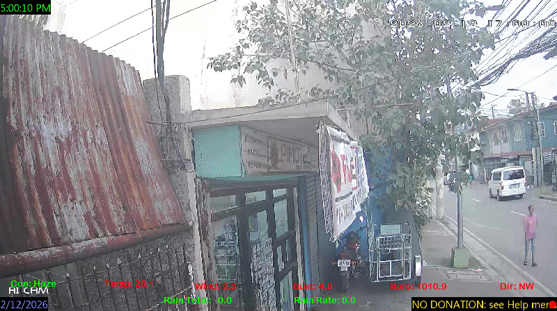 1 Rain season in the Philippines: June 1st to Oct 31st.   5 Estimated amount of water needed to replace the water used by plants and evaporation from the past week. (Negative numbers mean amount of water needed, positive numbers mean excess water is present).   6 Air Quality Index is provided by Luftdaten System esp8266 and is updated every 5 mins..   9 Solar Index represents either an absolute scale of solar energy (W/m²) using the station’s recorded maximum or a percentage of computed theoretical solar maximum using the station’s location and time of day. These indices differ most when the sun is low on the horizon. The current scale is shown, and will toggle if it or the icon is clicked.   10 Historical average only to day 12 of just the month of February for this station since 2016.   11 Historical average rain this season to day 12 of February for this station since 2016.