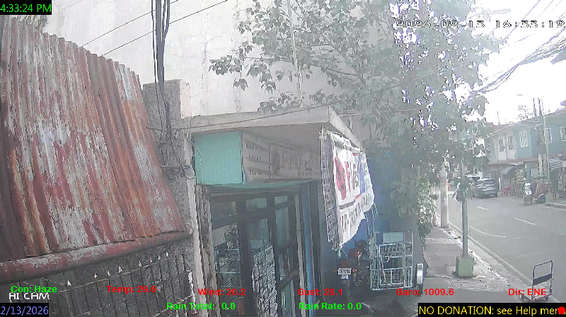 1 Rain season in the Philippines: June 1st to Oct 31st.   5 Estimated amount of water needed to replace the water used by plants and evaporation from the past week. (Negative numbers mean amount of water needed, positive numbers mean excess water is present).   6 Air Quality Index is provided by Luftdaten System esp8266 and is updated every 5 mins..   9 Solar Index represents either an absolute scale of solar energy (W/m²) using the station’s recorded maximum or a percentage of computed theoretical solar maximum using the station’s location and time of day. These indices differ most when the sun is low on the horizon. The current scale is shown, and will toggle if it or the icon is clicked.   10 Historical average only to day 13 of just the month of February for this station since 2016.   11 Historical average rain this season to day 13 of February for this station since 2016.