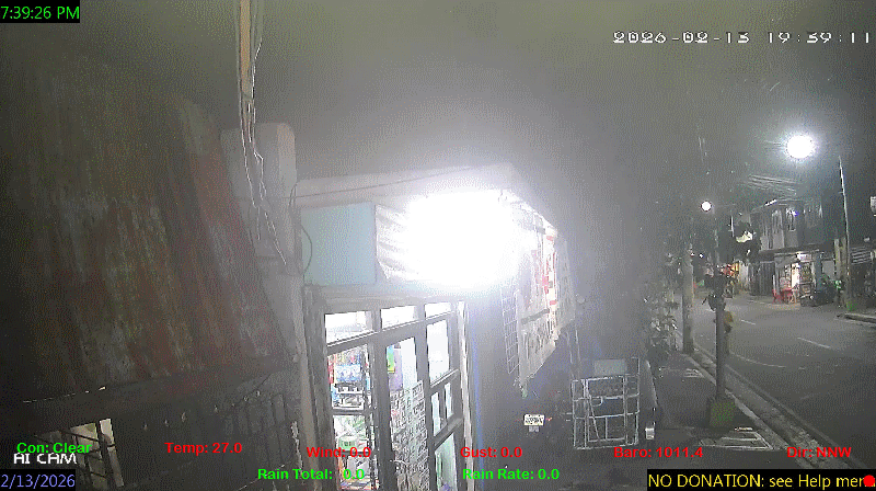 1 Rain season in the Philippines: June 1st to Oct 31st.   5 Estimated amount of water needed to replace the water used by plants and evaporation from the past week. (Negative numbers mean amount of water needed, positive numbers mean excess water is present).   6 Air Quality Index is provided by Luftdaten System esp8266 and is updated every 5 mins..   9 Solar Index represents either an absolute scale of solar energy (W/m²) using the station’s recorded maximum or a percentage of computed theoretical solar maximum using the station’s location and time of day. These indices differ most when the sun is low on the horizon. The current scale is shown, and will toggle if it or the icon is clicked.   10 Historical average only to day 13 of just the month of February for this station since 2016.   11 Historical average rain this season to day 13 of February for this station since 2016.