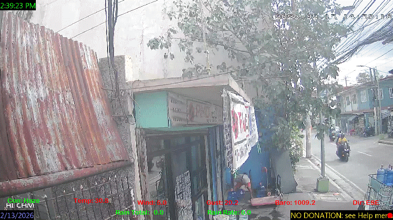1 Rain season in the Philippines: June 1st to Oct 31st.   5 Estimated amount of water needed to replace the water used by plants and evaporation from the past week. (Negative numbers mean amount of water needed, positive numbers mean excess water is present).   6 Air Quality Index is provided by Luftdaten System esp8266 and is updated every 5 mins..   9 Solar Index represents either an absolute scale of solar energy (W/m²) using the station’s recorded maximum or a percentage of computed theoretical solar maximum using the station’s location and time of day. These indices differ most when the sun is low on the horizon. The current scale is shown, and will toggle if it or the icon is clicked.   10 Historical average only to day 13 of just the month of February for this station since 2016.   11 Historical average rain this season to day 13 of February for this station since 2016.