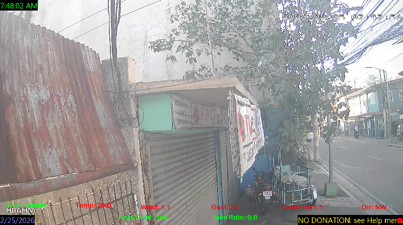 1 Rain season in the Philippines: June 1st to Oct 31st.   5 Estimated amount of water needed to replace the water used by plants and evaporation from the past week. (Negative numbers mean amount of water needed, positive numbers mean excess water is present).   6 Air Quality Index is provided by Luftdaten System esp8266 and is updated every 5 mins..   9 Solar Index represents either an absolute scale of solar energy (W/m²) using the station’s recorded maximum or a percentage of computed theoretical solar maximum using the station’s location and time of day. These indices differ most when the sun is low on the horizon. The current scale is shown, and will toggle if it or the icon is clicked.   10 Historical average only to day 25 of just the month of February for this station since 2016.   11 Historical average rain this season to day 25 of February for this station since 2016.
