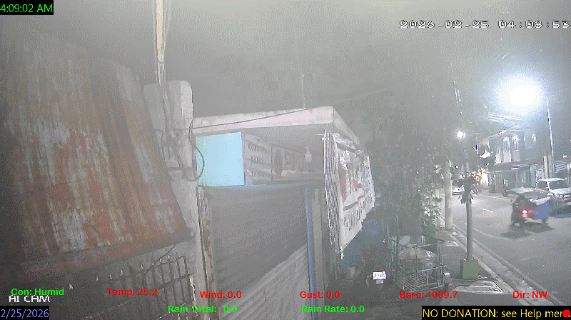 1 Rain season in the Philippines: June 1st to Oct 31st.   5 Estimated amount of water needed to replace the water used by plants and evaporation from the past week. (Negative numbers mean amount of water needed, positive numbers mean excess water is present).   6 Air Quality Index is provided by Luftdaten System esp8266 and is updated every 5 mins..   9 Solar Index represents either an absolute scale of solar energy (W/m²) using the station’s recorded maximum or a percentage of computed theoretical solar maximum using the station’s location and time of day. These indices differ most when the sun is low on the horizon. The current scale is shown, and will toggle if it or the icon is clicked.   10 Historical average only to day 25 of just the month of February for this station since 2016.   11 Historical average rain this season to day 25 of February for this station since 2016.