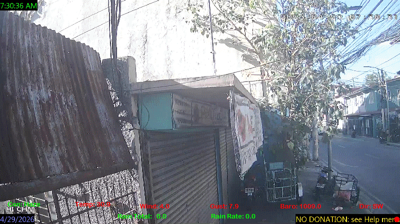 1 Rain season in the Philippines: June 1st to Oct 31st.   5 Estimated amount of water needed to replace the water used by plants and evaporation from the past week. (Negative numbers mean amount of water needed, positive numbers mean excess water is present).   6 Air Quality Index is provided by Luftdaten System esp8266 and is updated every 5 mins..   10 Historical average only to day 29 of just the month of April for this station since 2017.   11 Historical average rain this season to day 29 of April for this station since 2017.
