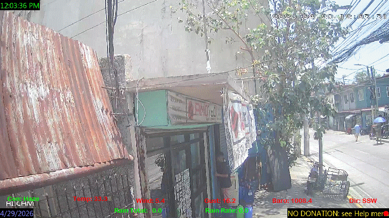 1 Rain season in the Philippines: June 1st to Oct 31st.   5 Estimated amount of water needed to replace the water used by plants and evaporation from the past week. (Negative numbers mean amount of water needed, positive numbers mean excess water is present).   6 Air Quality Index is provided by Luftdaten System esp8266 and is updated every 5 mins..   9 Solar Index represents either an absolute scale of solar energy (W/m²) using the station’s recorded maximum or a percentage of computed theoretical solar maximum using the station’s location and time of day. These indices differ most when the sun is low on the horizon. The current scale is shown, and will toggle if it or the icon is clicked.   10 Historical average only to day 29 of just the month of April for this station since 2017.   11 Historical average rain this season to day 29 of April for this station since 2017.