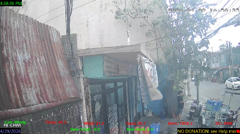 1 Rain season in the Philippines: June 1st to Oct 31st.   5 Estimated amount of water needed to replace the water used by plants and evaporation from the past week. (Negative numbers mean amount of water needed, positive numbers mean excess water is present).   6 Air Quality Index is provided by Luftdaten System esp8266 and is updated every 5 mins..   9 Solar Index represents either an absolute scale of solar energy (W/m²) using the station’s recorded maximum or a percentage of computed theoretical solar maximum using the station’s location and time of day. These indices differ most when the sun is low on the horizon. The current scale is shown, and will toggle if it or the icon is clicked.   10 Historical average only to day 27 of just the month of April for this station since 2017.   11 Historical average rain this season to day 27 of April for this station since 2017.