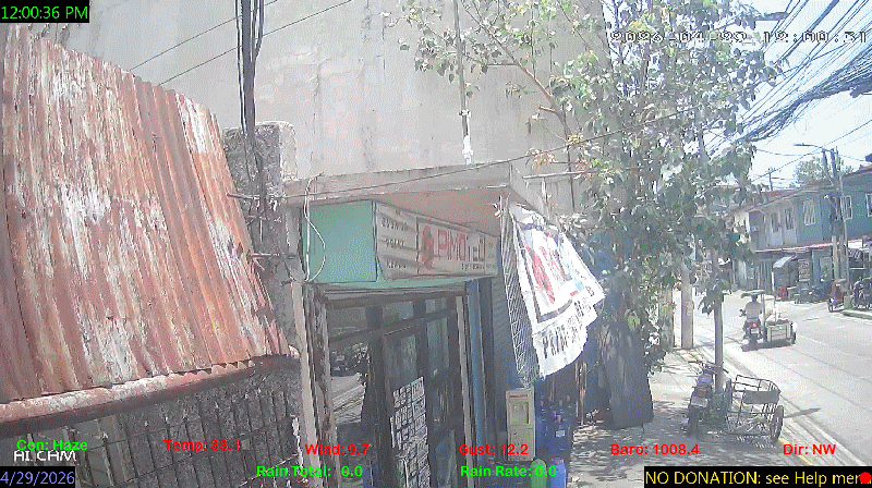 1 Rain season in the Philippines: June 1st to Oct 31st.   5 Estimated amount of water needed to replace the water used by plants and evaporation from the past week. (Negative numbers mean amount of water needed, positive numbers mean excess water is present).   6 Air Quality Index is provided by Luftdaten System esp8266 and is updated every 5 mins..   9 Solar Index represents either an absolute scale of solar energy (W/m²) using the station’s recorded maximum or a percentage of computed theoretical solar maximum using the station’s location and time of day. These indices differ most when the sun is low on the horizon. The current scale is shown, and will toggle if it or the icon is clicked.   10 Historical average only to day 29 of just the month of April for this station since 2017.   11 Historical average rain this season to day 29 of April for this station since 2017.