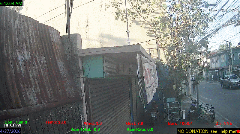 1 Rain season in the Philippines: June 1st to Oct 31st.   5 Estimated amount of water needed to replace the water used by plants and evaporation from the past week. (Negative numbers mean amount of water needed, positive numbers mean excess water is present).   6 Air Quality Index is provided by Luftdaten System esp8266 and is updated every 5 mins..   10 Historical average only to day 27 of just the month of April for this station since 2017.   11 Historical average rain this season to day 27 of April for this station since 2017.