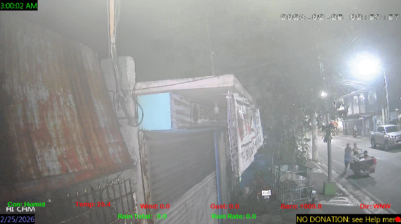 1 Rain season in the Philippines: June 1st to Oct 31st.   5 Estimated amount of water needed to replace the water used by plants and evaporation from the past week. (Negative numbers mean amount of water needed, positive numbers mean excess water is present).   6 Air Quality Index is provided by Luftdaten System esp8266 and is updated every 5 mins..   9 Solar Index represents either an absolute scale of solar energy (W/m²) using the station’s recorded maximum or a percentage of computed theoretical solar maximum using the station’s location and time of day. These indices differ most when the sun is low on the horizon. The current scale is shown, and will toggle if it or the icon is clicked.   10 Historical average only to day 25 of just the month of February for this station since 2016.   11 Historical average rain this season to day 25 of February for this station since 2016.