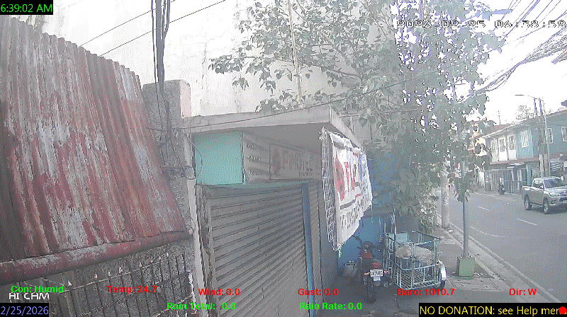 1 Rain season in the Philippines: June 1st to Oct 31st.   5 Estimated amount of water needed to replace the water used by plants and evaporation from the past week. (Negative numbers mean amount of water needed, positive numbers mean excess water is present).   6 Air Quality Index is provided by Luftdaten System esp8266 and is updated every 5 mins..   9 Solar Index represents either an absolute scale of solar energy (W/m²) using the station’s recorded maximum or a percentage of computed theoretical solar maximum using the station’s location and time of day. These indices differ most when the sun is low on the horizon. The current scale is shown, and will toggle if it or the icon is clicked.   10 Historical average only to day 25 of just the month of February for this station since 2016.   11 Historical average rain this season to day 25 of February for this station since 2016.