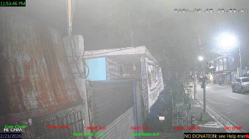 1 Rain season in the Philippines: June 1st to Oct 31st.   5 Estimated amount of water needed to replace the water used by plants and evaporation from the past week. (Negative numbers mean amount of water needed, positive numbers mean excess water is present).   6 Air Quality Index is provided by Luftdaten System esp8266 and is updated every 5 mins..   9 Solar Index represents either an absolute scale of solar energy (W/m²) using the station’s recorded maximum or a percentage of computed theoretical solar maximum using the station’s location and time of day. These indices differ most when the sun is low on the horizon. The current scale is shown, and will toggle if it or the icon is clicked.   10 Historical average only to day 23 of just the month of February for this station since 2016.   11 Historical average rain this season to day 23 of February for this station since 2016.