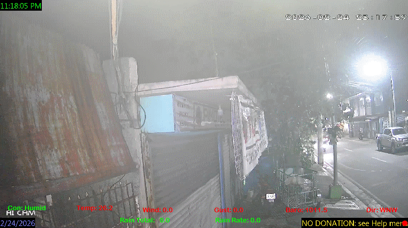 1 Rain season in the Philippines: June 1st to Oct 31st.   5 Estimated amount of water needed to replace the water used by plants and evaporation from the past week. (Negative numbers mean amount of water needed, positive numbers mean excess water is present).   6 Air Quality Index is provided by Luftdaten System esp8266 and is updated every 5 mins..   9 Solar Index represents either an absolute scale of solar energy (W/m²) using the station’s recorded maximum or a percentage of computed theoretical solar maximum using the station’s location and time of day. These indices differ most when the sun is low on the horizon. The current scale is shown, and will toggle if it or the icon is clicked.   10 Historical average only to day 24 of just the month of February for this station since 2016.   11 Historical average rain this season to day 24 of February for this station since 2016.