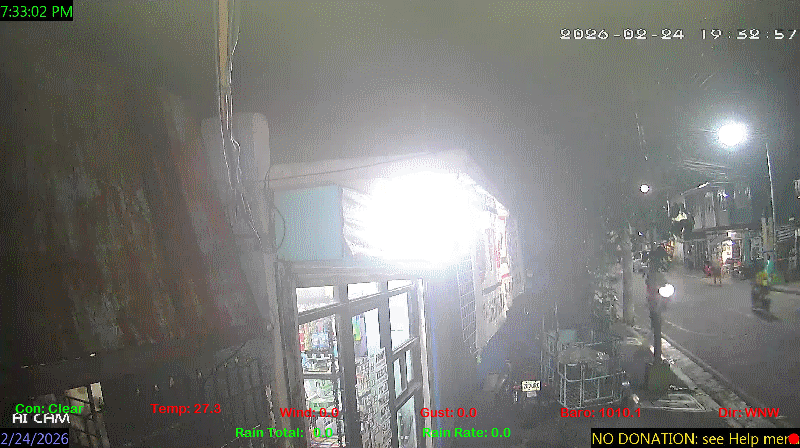 1 Rain season in the Philippines: June 1st to Oct 31st.   5 Estimated amount of water needed to replace the water used by plants and evaporation from the past week. (Negative numbers mean amount of water needed, positive numbers mean excess water is present).   6 Air Quality Index is provided by Luftdaten System esp8266 and is updated every 5 mins..   9 Solar Index represents either an absolute scale of solar energy (W/m²) using the station’s recorded maximum or a percentage of computed theoretical solar maximum using the station’s location and time of day. These indices differ most when the sun is low on the horizon. The current scale is shown, and will toggle if it or the icon is clicked.   10 Historical average only to day 24 of just the month of February for this station since 2016.   11 Historical average rain this season to day 24 of February for this station since 2016.