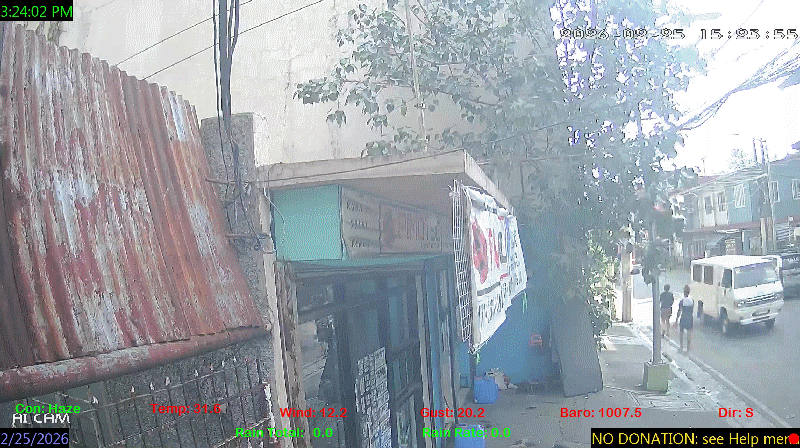 1 Rain season in the Philippines: June 1st to Oct 31st.   5 Estimated amount of water needed to replace the water used by plants and evaporation from the past week. (Negative numbers mean amount of water needed, positive numbers mean excess water is present).   6 Air Quality Index is provided by Luftdaten System esp8266 and is updated every 5 mins..   10 Historical average only to day 25 of just the month of February for this station since 2016.   11 Historical average rain this season to day 25 of February for this station since 2016.