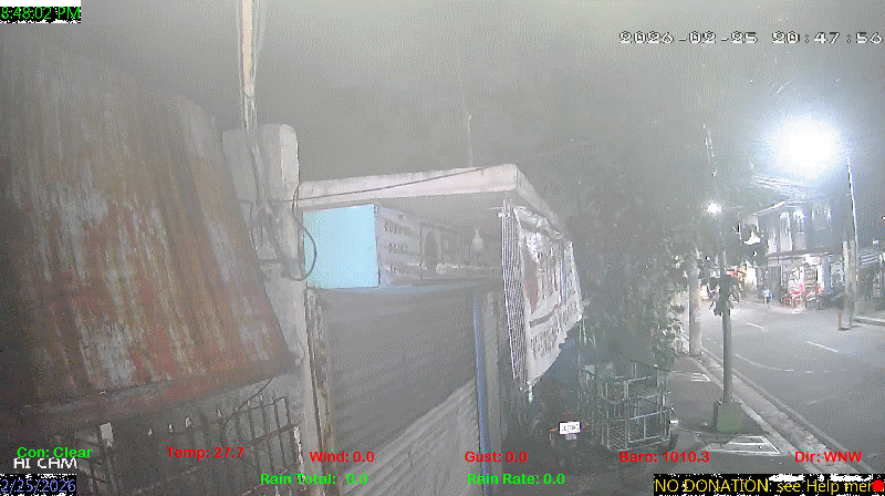 1 Rain season in the Philippines: June 1st to Oct 31st.   5 Estimated amount of water needed to replace the water used by plants and evaporation from the past week. (Negative numbers mean amount of water needed, positive numbers mean excess water is present).   6 Air Quality Index is provided by Luftdaten System esp8266 and is updated every 5 mins..   9 Solar Index represents either an absolute scale of solar energy (W/m²) using the station’s recorded maximum or a percentage of computed theoretical solar maximum using the station’s location and time of day. These indices differ most when the sun is low on the horizon. The current scale is shown, and will toggle if it or the icon is clicked.   10 Historical average only to day 25 of just the month of February for this station since 2016.   11 Historical average rain this season to day 25 of February for this station since 2016.