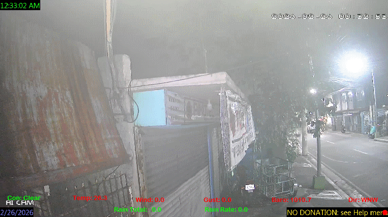 1 Rain season in the Philippines: June 1st to Oct 31st.   5 Estimated amount of water needed to replace the water used by plants and evaporation from the past week. (Negative numbers mean amount of water needed, positive numbers mean excess water is present).   6 Air Quality Index is provided by Luftdaten System esp8266 and is updated every 5 mins..   9 Solar Index represents either an absolute scale of solar energy (W/m²) using the station’s recorded maximum or a percentage of computed theoretical solar maximum using the station’s location and time of day. These indices differ most when the sun is low on the horizon. The current scale is shown, and will toggle if it or the icon is clicked.   10 Historical average only to day 25 of just the month of February for this station since 2016.   11 Historical average rain this season to day 25 of February for this station since 2016.