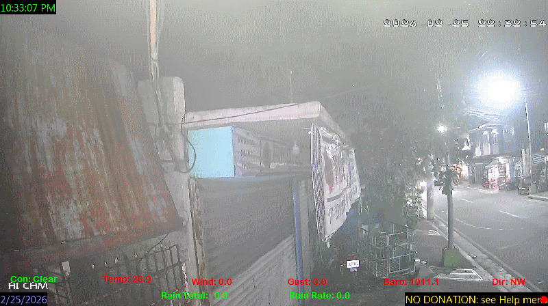 1 Rain season in the Philippines: June 1st to Oct 31st.   5 Estimated amount of water needed to replace the water used by plants and evaporation from the past week. (Negative numbers mean amount of water needed, positive numbers mean excess water is present).   6 Air Quality Index is provided by Luftdaten System esp8266 and is updated every 5 mins..   9 Solar Index represents either an absolute scale of solar energy (W/m²) using the station’s recorded maximum or a percentage of computed theoretical solar maximum using the station’s location and time of day. These indices differ most when the sun is low on the horizon. The current scale is shown, and will toggle if it or the icon is clicked.   10 Historical average only to day 25 of just the month of February for this station since 2016.   11 Historical average rain this season to day 25 of February for this station since 2016.