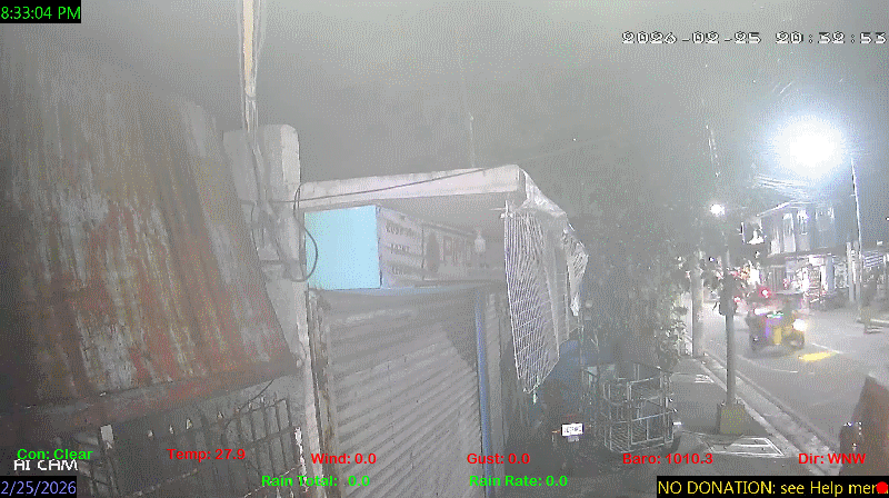 1 Rain season in the Philippines: June 1st to Oct 31st.   5 Estimated amount of water needed to replace the water used by plants and evaporation from the past week. (Negative numbers mean amount of water needed, positive numbers mean excess water is present).   6 Air Quality Index is provided by Luftdaten System esp8266 and is updated every 5 mins..   9 Solar Index represents either an absolute scale of solar energy (W/m²) using the station’s recorded maximum or a percentage of computed theoretical solar maximum using the station’s location and time of day. These indices differ most when the sun is low on the horizon. The current scale is shown, and will toggle if it or the icon is clicked.   10 Historical average only to day 25 of just the month of February for this station since 2016.   11 Historical average rain this season to day 25 of February for this station since 2016.